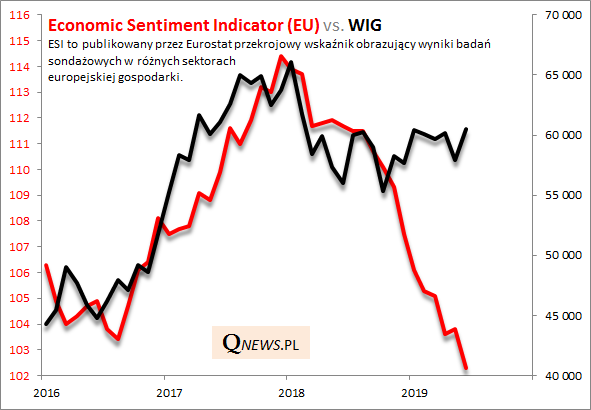 Co ciekawe jednak giełdy przestały tak wyraźnie reagować na zadyszkę gospodarczą jak miało to miejsce początkowo. WIG jest zdecydowanie wyżej, niż gdyby trzymał się ściśle ścieżki nakreślonej przez ESI.