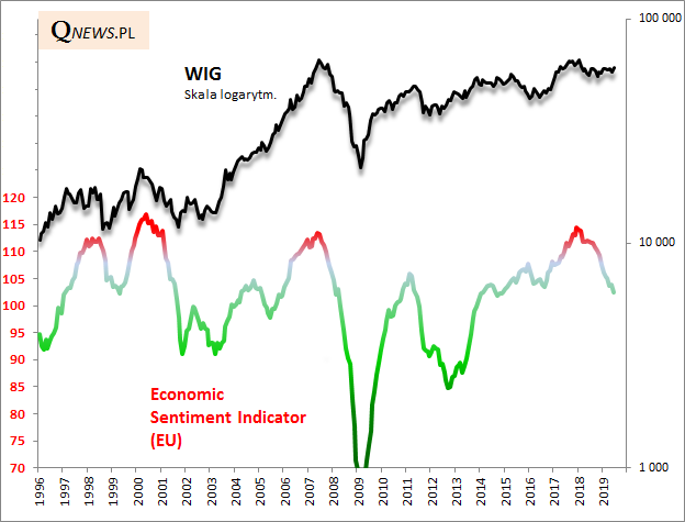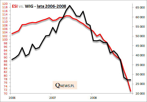 Czy to oznacza, że WIG niebezpiecznie ignoruje trendy makroekonomiczne? Niekoniecznie. Być może realizuje się raczej scenariusz z lat 2010-2012, gdy "oderwanie się" WIG-u od spadającego ESI zwiastowało późniejszą poprawę w gospodarkach.