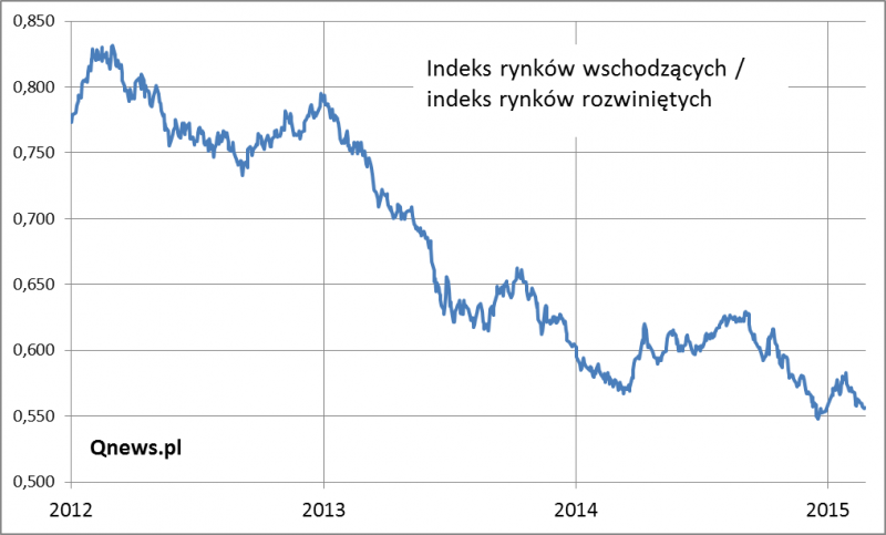 Globalna hossa okazuje się jeszcze bardziej wybiórcza, jeśli spojrzymy na inną grupę krajów - rynki wschodzące. Ich indeks (MSCI Emerging Markets) do szczytów ma daleko. Wskaźnik siły relatywnej tego indeksu względem rynków rozwiniętych szoruje zaś po dnie. Nie powinno to dziwić w warunkach bessy surowcowej i obaw przed globalną deflacją - takie otoczenie nigdy nie sprzyjało emerging markets.