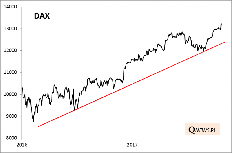 Osłabienie euro stało się jednocześnie impulsem dla niemieckiego DAX-a to ustanowienia nowego rekordu hossy (słabsze euro to większe zyski eksporterów).