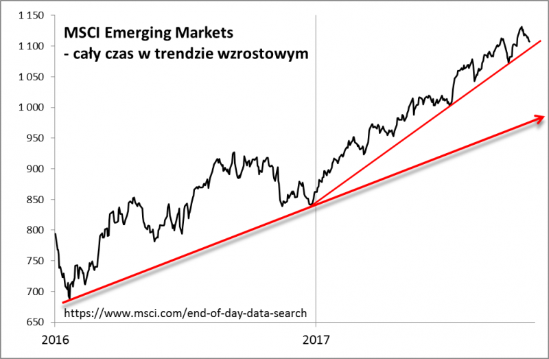Co ciekawe jednak aprecjacja dolara ma dość ograniczony wpływ na inne klasy aktywów, w szczególności na rynki wschodzące. Ich indeks, choć korygował się w ostatnich dniach, to pozostaje jednak w trendzie wzrostowym. Dopiero przebicie widocznej na wykresie linii byłoby ostrzeżeniem, że coś zaczyna się tu psuć.