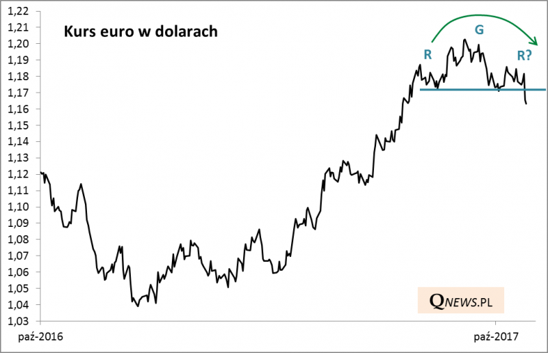 Dość "gołębi" wydźwięk najnowszych decyzji Europejskiego Banku Centralnego o przedłużeniu QE (choć w o połowę mniejszej skali - 30 mld EUR/mies.) do września 2018 i deklaracja, że potem program znów może zostać przedłużony - to wszystko stało się impulsem do osłabienia euro, a tym samym umocnienia dolara. Kurs EUR/USD ukształtował już w pełni opisywaną przez nas niedawno formację "głowy z ramionami" (RGR)...