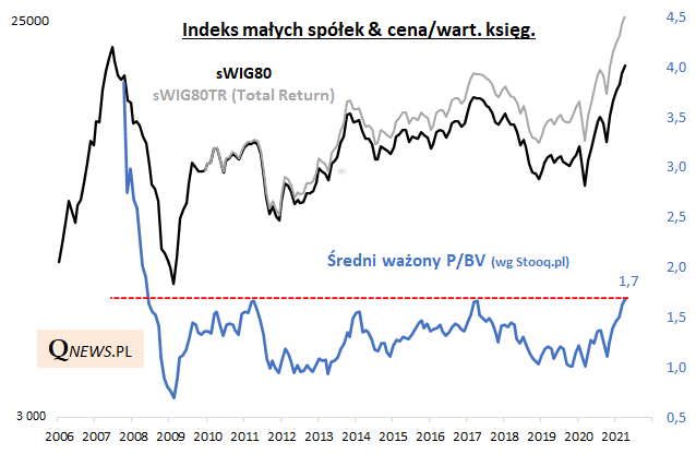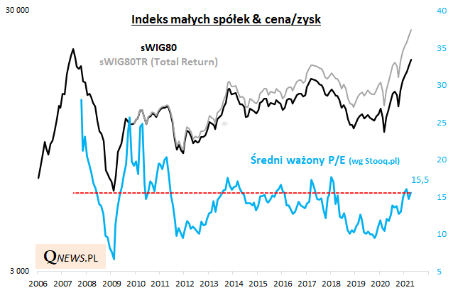 Po pierwsze P/E (cena/zysk). Obecnie wynosi 15,5 (średnia ważona udziałami w indeksie). Wg tego kryterium "maluchy" na GPW nie są z pewnością tanie, ale też nie są bardzo drogie z historycznego punktu widzenia. Na poprzednich szczytach koniunktury (2017, 2013) P/E osiągał ok. 17,5, zaś w punkcie kulminacyjnym pamiętnej hossy lat 2006-2007 zupełnie bujał w obłokach (> 30).