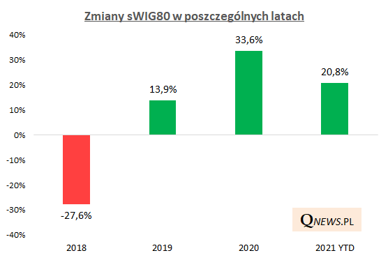 Indeks akcji małych spółek na GPW (sWIG80) ciągle deklasuje wiele innych indeksów, zarówno krajowych jak i zagranicznych. Od początku roku zyskał już 20% i jest to trzeci kolejny rok, w którym osiąga dwucyfrową stopę zwrotu.
