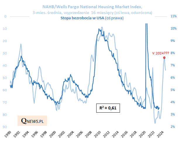 Reasumując, sprawdzony historycznie indeks NAHB obrazujący nastroje w mieszkalnictwie w USA, z jednej strony oddaje głos za "twardym lądowaniem" gospodarki, czyli wzrostem stopy bezrobocia (który miałby nastąpić stopniowo gdzieś między III kw. 2023 i II kw. 2024), ale jednocześnie kreśli już perspektywę późniejszej poprawy, która miałaby być napędzana spadkiem kosztów finansowania, którego przedsmak widać już w ostatnich miesiącach.