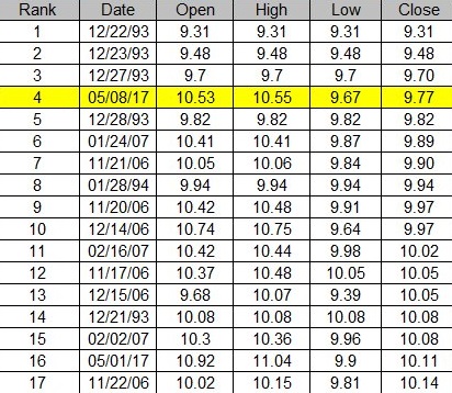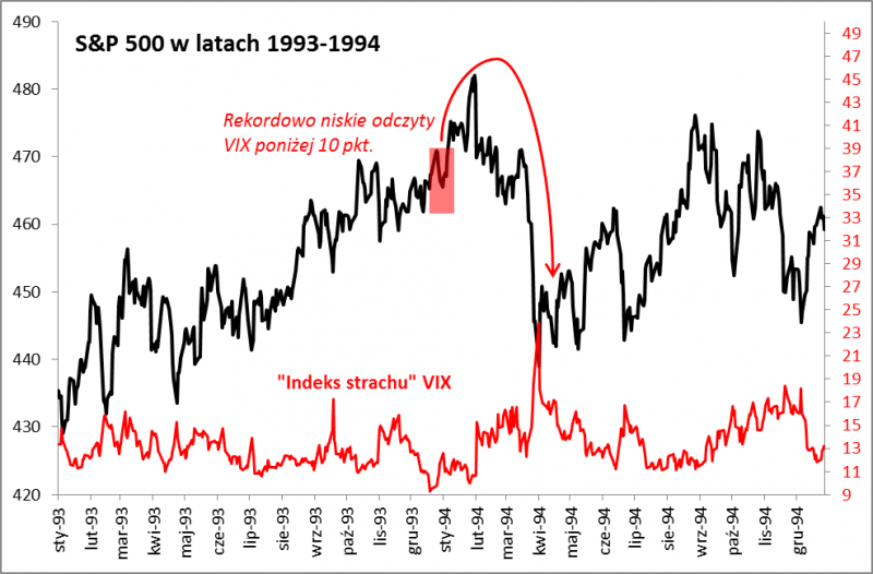 Jak widać w tamtym czasie po rekordowo niskich odczytach VIX-a trend wzrostowy na Wall Street był jeszcze kontynuowany przez ok. miesiąc, a potem zaczęły się kłopoty, czyli głęboka korekta spadkowa (-9%).