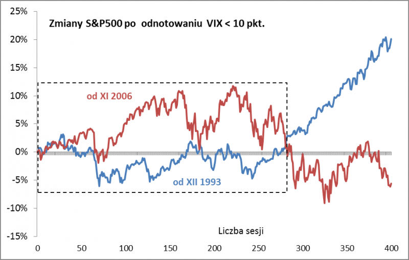 Zauważmy, że w obu historycznych przypadkach w ciągu nieco ponad roku (ok. 270 sesji) po odnotowaniu VIX-a poniżej 10 pkt. S&P500 przebywał właściwie w trendzie bocznym. Co prawda momentami zabierał się za atakowanie szczytów i to z chwilowym sukcesem (lata 2006-2007), ale potem powracał do punktu wyjścia. Podobieństwo obu tych przypadków urywa się właśnie mniej więcej po roku - potem ścieżki stawały się już zupełnie rozbieżne (wznowienie hossy w 1994 i początek bessy pod koniec 2007).