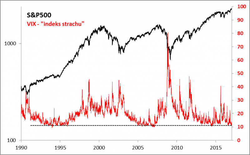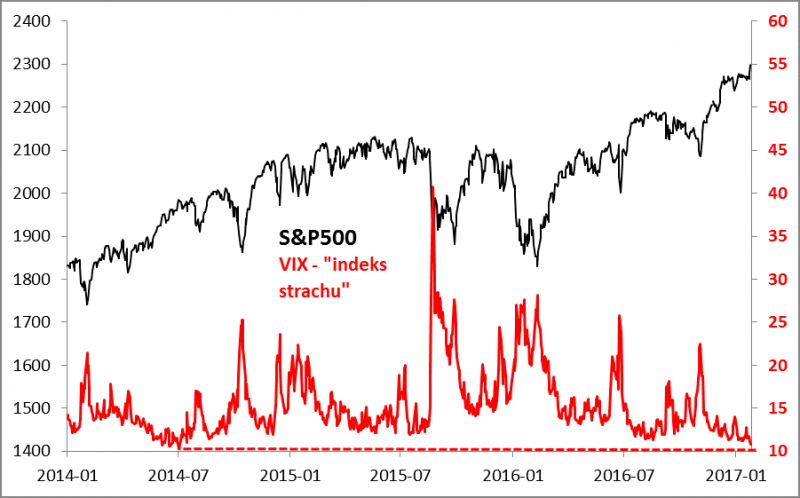 Wspinaczce amerykańskich indeksów na rekordowe poziomy towarzyszy ciekawe zjawisko - spadek wskaźnika VIX, zwanego "indeksem strachu", do bardzo niskich pułapów. Choć oficjalnie VIX jest jedynie miernikiem zmienności notowań giełdowych oczekiwanej przez uczestników rynku opcji, to jednak ma jedną charakterystyczną cechę - z reguły korekty spadkowe na Wall Street są poprzedzone niskimi wartościami VIX-a, zaś w trakcie spadków "indeks strachu" gwałtownie skacze w górę (stąd też nazwa).