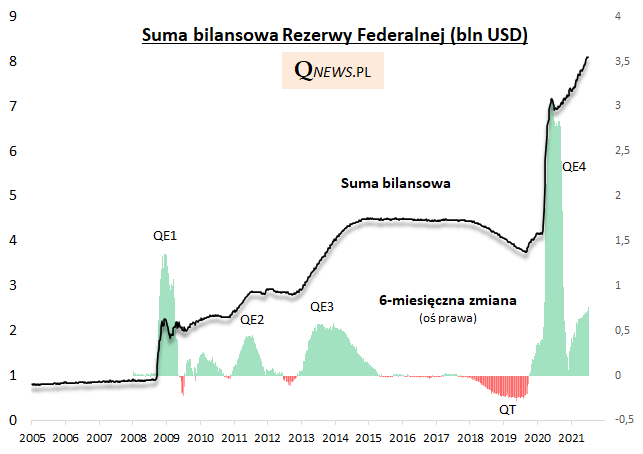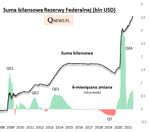 Warto przy tym zauważyć, że koniec QE oznaczałby jedynie brak wzrostu sumy bilansowej, a nie jej spadek (operacja "normalizacji" czyli zmniejszenia bilansu, zwana też czasem QT czyli quantitative tightening, odbyła się w latach 2018-19, przyczyniając się do kolejnych wstrząsów na rynkach - ostatecznie w końcówce 2019 Fed się z niej nagle wycofał).