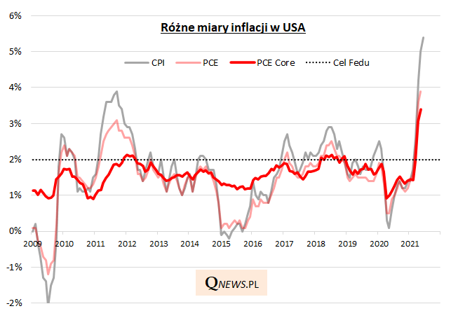 Inflacja na świecie nie przestaje zaskakiwać. 5,4% - do takiego pułapu zawędrował wskaźnik rocznej inflacji CPI w USA, kontynuując gwałtowne przyspieszenie z poprzednich miesięcy. W ślad za nim w górę podążają faworyzowane przez Rezerwę Federalną wskaźniki PCE i PCE Core (czerwcowe odczyty jeszcze nie są znane, w maju wyniosły odpowiednio 3,9% i 3,4%).