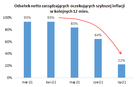 Nic dziwnego, że Fed zmuszony jest coraz częściej tłumaczyć się z coraz większego odchylenia inflacji od oficjalnego celu (2%). Linia obrony polega na argumentowaniu, że podwyższona inflacja jest "przejściowa" (transitory). Co ciekawe oczekiwania rynkowe zdają się wpisywać w ten rok myślenia. Wg najnowszego globalnego sondażu Bank of America 70% ankietowanych zarządzających funduszami zgadza się, że wysoka inflacja jest przejściowa. Sondażowe oczekiwania inflacyjne konsekwentnie od trzech miesięcy idą w dół.