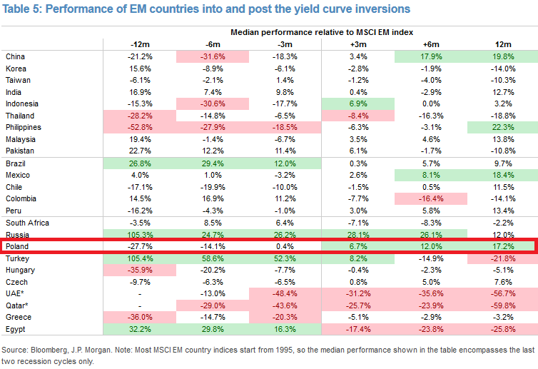 Ledwie pochyliliśmy się nad kolejnym etapem odwrócenia krzywej rentowności obligacji w USA, a już natrafiliśmy na raport J.P. Morgan, w którym ten bank przygląda się kwestii tego jak w związku z inwersją zachowywały się ceny akcji na rynkach wschodzących. Najbardziej w tym raporcie zainteresował nas wątek polski.