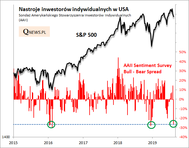 Jeśli wierzyć jednemu z monitorowanych przez nas wskaźników - sondażowi Amerykańskiego Stowarzyszenia Inwestorów Indywidualnych (AAII) - "sentyment" uległ mocnemu schłodzeniu. Tak mocnemu, jak w okolicach dołków poprzednich większych korekt spadkowych.