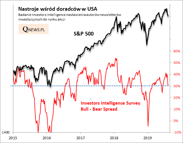 Ale nie wszystkie wskaźniki potwierdzają już tak silne schłodzenie. Inne badanie, tym razem odnośnie nastawienia autorów tzw. biuletynów inwestycyjnych, pokazuje, że do strachu takiego jak np. w grudniu jeszcze sporo brakuje (ale błędem byłoby założenie, że w przypadku każdej korekty wskaźnik musiał zejść aż tak nisko).