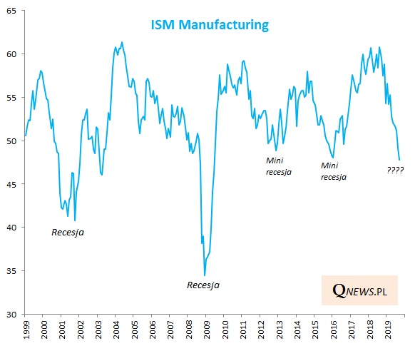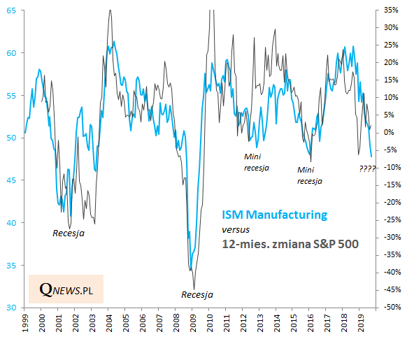 Obecny odczyt jest już położony nieco niżej niż dołki z lat 2016 i 2012, kiedy to mieliśmy do czynienia jedynie z przejściowym spowolnieniem koniunktury, czy też swoistą "mini recesją". Poprzednio ISM spadł do podobnego pułapu jeszcze we ... wrześniu 2008. To właśnie wtedy upadł bank Lehman Brothers (największa panika na rynkach miała miejsce w październiku).