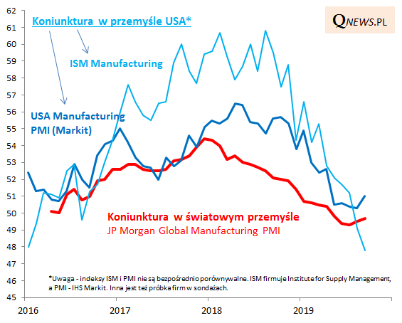 Zaskakująco niski odczyt amerykańskiego barometru koniunktury w przemyśle ISM Manufacturing (47,8 pkt.) wywołał nerwowość na rynkach akcji i zwiększył oczekiwania na kolejną obniżkę stóp procentowych już w tym miesiącu. Być może zwiększa też szanse na wygaszenie wojen handlowych, które ewidentnie coraz bardziej odciskają się piętnem także na amerykańskim przemyśle.
