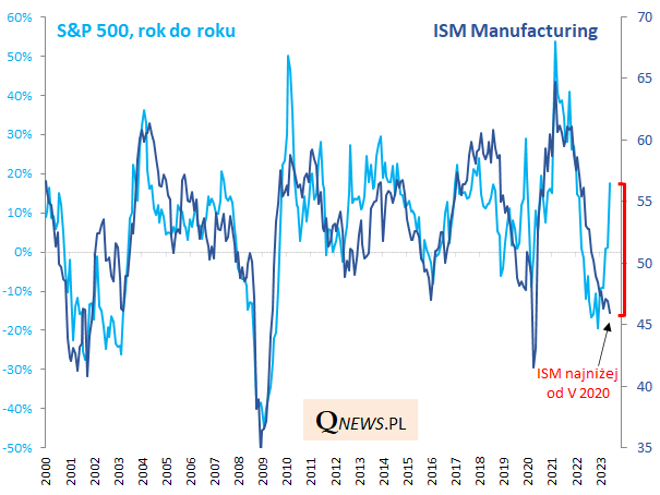 A może ten powiększający się rozjazd jest tylko efektem sposobu prezentacji? Może należy spojrzeć nie bezpośrednio na ISM, lecz - tak jak w przypadku S&P 500 - na jego 12-miesięczne zmiany? Poniżej pokazujemy również takie alternatywne podejście. Na plus należy zapisać fakt, że roczna dynamika przemysłowego barometru ... podnosi się stopniowo, mimo dalszego spadku samego barometru. To efekt tego, że przed rokiem spadek ISM był gwałtowniejszy niż obecnie.
