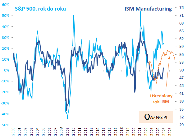 Największy paradoks polega też na tym, że gdyby ISM trzymał się uśrednionej historycznej ścieżki, to powinien niebawem (w okolicach III kw. 2025) ukształtować szczyt koniunktury, z którego potem zacząłby schodzić w dół - taki punkt w cyklu był najbardziej niebezpieczny dla inwestorów. Na razie wskaźnik jest ciągle zaskakująco nisko, choć zaczął w końcu nadrabiać zaległości. W kolejnych miesiącach zobaczymy, czy będzie kontynuował pogoń za rynkami, które już dużo wcześniej zdyskontowały poprawę koniunktury gospodarczej.