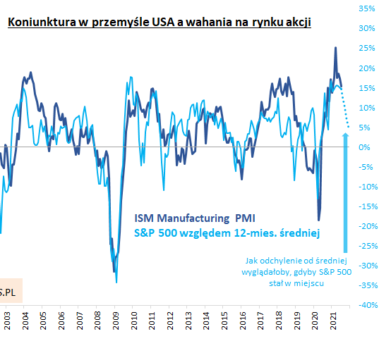 Pytanie brzmi: co z akcjami działoby się, gdyby ISM kontynuował spadek? Zapewne pociągnęłoby to za sobą zmniejszanie się różnicy między S&P 500, a średnią 12-miesięczną. Jednak jak pokazuje linia przerywana, wystarczyłoby, aby amerykański indeks stał w miejscu, a dystans względem średniej ruchomej zmniejszyłby się w okolicę +5% na koniec roku (wynika to z tego, że nawet przy zastoju S&P 500 średnia krocząca ciągle rosłaby).