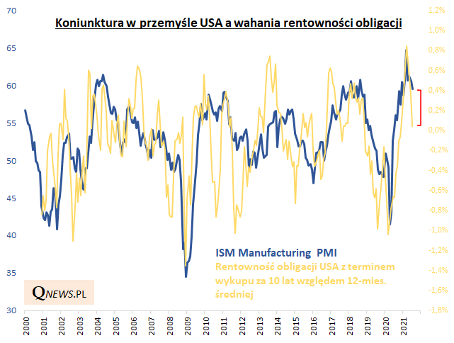 Reasumując, o ile kilkunastomiesięczne wychodzenie ISM Manufacturing z pandemicznego dołka pociągnęło za sobą gwałtowną hossę na Wall Street przy jednoczesnych stratach z obligacji (na skutek wzrostu ich rentowności i spadku cen), to teraz ISM systematycznie schodzi ze szczytu koniunktury, co w przypadku kontynuacji tego trendu może wywierać negatywną presję na amerykańskie akcje (w formie zastoju lub korekty) oraz pozytywną na obligacje (z tym zastrzeżeniem, że przejściowo lipcowy spadek rentowności wydawać się może zbyt silny). Oczywiście rozważania te dotyczą bardziej kilkumiesięcznej niż kilkudniowej lub kilkutygodniowej perspektywy.