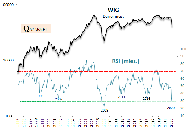 Jeśli na WIG spojrzeć przez pryzmat danych miesięcznych, widać, że rodzime akcje stały się skrajnie "wyprzedane" w rozumieniu miesięcznego wskaźnika RSI (Relative Strength Index). To dopiero drugi taki historyczny przypadek - do tej pory niższe wartości miesięcznego RSI odnotowaliśmy wyłącznie w okresie styczeń-luty 2009.