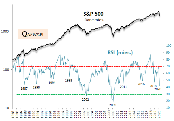 Uwaga - gdyby indeks zakończył marzec na poziomie miesięcznego minimum, RSI byłby o wiele bliżej strefy wyprzedania (ok. 33 pkt.)