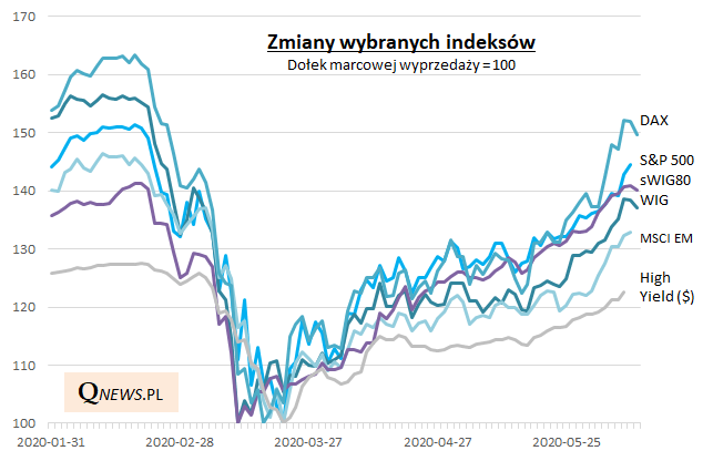 Przegląd poszczególnych ryzykownych aktywów pokazuje, że zwyżka trwająca od punktu kulimacyjnego "koronawirusowej" paniki ma dość solidarny charakter. Innymi słowy, w trendzie tym uczestniczą rozmaite obserwowane przez nas indeksy giełdowe - zarówno w skali globalnej (np. USA, Niemcy), jak i na GPW - oraz inne ryzykowne aktywa, takie jak obligacje korporacyjne typu "high yield" (o podwyższonym ryzyku/rentowności). Co ciekawe niektóre z indeksów odrobiły już całe lub niemal całe straty z czasu załamania - i do tego grona należy ... rodzimy sWIG80 (kojarzony z małymi spółkami).