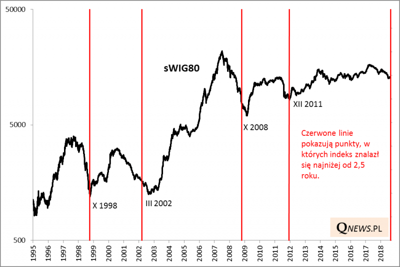 Podczas gdy indeksy na Wall Street są w okolicach rekordów, to najsłabsze ogniwo polskiego rynku akcji - małe spółki - ciągle nie może odzyskać lepszej formy (swoją drogą to pokazuje, jak ważna jest szeroka dywersyfikacja portfela inwestycyjnego). Mimo sygnalizowanej przez nas wcześniej poprawy otoczenia makroekonomicznego, sWIG80 ciągle ugina się pod presją specyficznych zdarzeń dotyczących poszczególnych spółek przy jednoczesnym braku świeżego kapitału (pod tym względem sytuację może w dalszej perspektywie poprawić wdrożenie programu PPK). W piątek indeks znalazł się w okolicach czerwcowego dołka. W cenach zamknięcia nawet go już pogłębił, co oznacza, że znalazł się najniższej od mniej więcej 2,5 roku (w warunkach hossy na globalnych rynkach!). Zobaczmy kiedy historycznie osiągał takie 2,5-letnie minima.