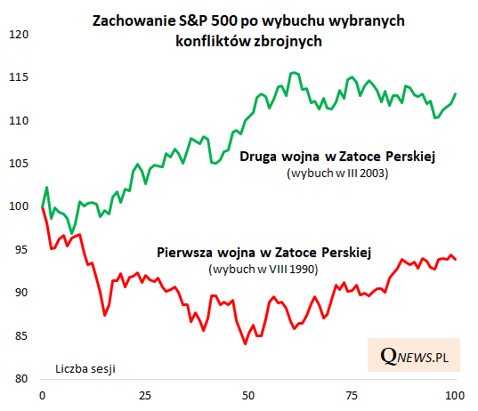 Zauważmy, że szanse na zwyżkę S&P 500 po wypunktowanych w tabeli zdarzeniach przypominały wynik przysłowiowego rzutu kostką. W połowie przypadków po 1., 3. i 12. miesiącach od pojawienia się danego punktu zapalnego amerykański benchmark zyskiwał, a w drugiej połowie przypadków spadał. Oczywiście wiele w takich obliczeniach zależy od subiektywnego z natury doboru historycznych zdarzeń (powyższą listę można by potencjalnie znacznie rozszerzyć). Niemniej nawet zestawienie pozornie bardzo podobnych do siebie przypadków, takich jak dwie wojny w Zatoce Perskiej pokazuje, że scenariusze dla Wall Street potrafiły się bardzo różnić. Kluczowe było to, co w tym czasie działo się w gospodarce globalnej (1990 - recesja w USA, 2003 - początek ekspansji po recesji).