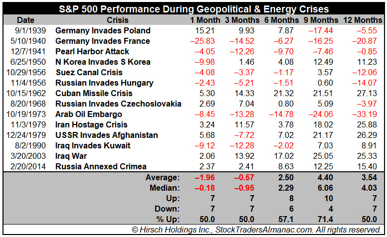 Jak wygląda wybuch wojny w Ukrainie z perspektywy Wall Street? Analitycy za oceanem mają bez wątpienia ten komfort, że wydarzenia te są dla nich odległym geograficznie epizodem, któremu można się na chłodno przyjrzeć przez pryzmat długiej listy porównywalnych, historycznych przypadków. W komentarzach pojawiły się rozmaite statystyki pokazujące jak indeks S&P 500 zachowywał się po wybuchach konfliktów zbrojnych.