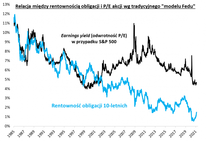 Jednym z ważniejszych elementów trwającej debaty na temat wzrostu rentowności obligacji skarbowych w USA jest relacja między atrakcyjnością tych papierów, a wycenami akcji.