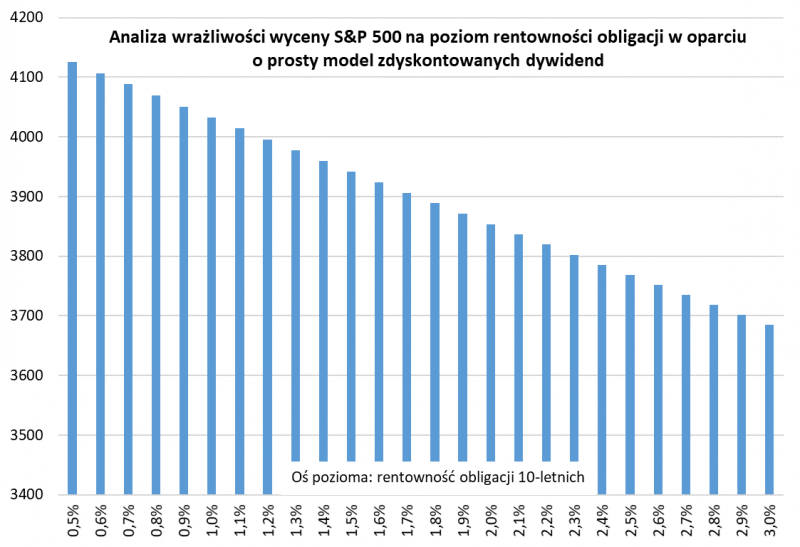 Wzrost rentowności obligacji skarbowych o każde 0,1 pkt. proc. przekłada się na zmniejszenie fundamentalnej wyceny S&P 500 o 0,5 proc. wg naszego prostego modelu zdyskontowanych dywidend.