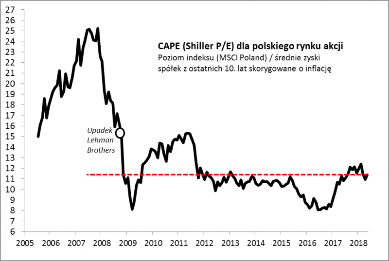 Weźmy choćby pod uwagę popularny za oceanem wskaźnik CAPE (P/E w wersji prof. Shillera), który obliczyliśmy dla polskiej giełdy (o czym obszernie pisaliśmy przed niespełna miesiącem). Jeszcze w połowie 2016 roku ta miara wycen była na poziomie … dołka bessy w 2009 roku. Co prawda w 2017 r. CAPE podrósł, ale w ostatnich miesiącach znów zawrócił w kierunku dołków. Jego obecny pułap jest porównywalny nie z tym z początku bessy w 2008 roku, lecz raczej z tym odnotowanym … po upadku Lehman Brothers na jesieni 2008.