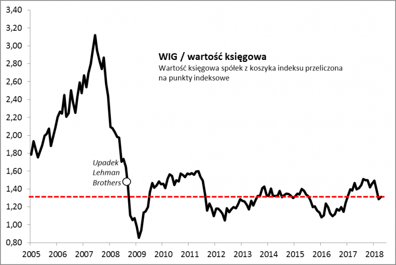 Bardzo podobne wnioski płyną z monitorowanych przez nas wskaźników cena/wartość księgowa (P/BV). Jakkolwiek WIG w ostatnich miesiącach korygował się z poziomu rekordu wszech czasów, to P/BV cofnął się do pułapu z jesieni 2008.