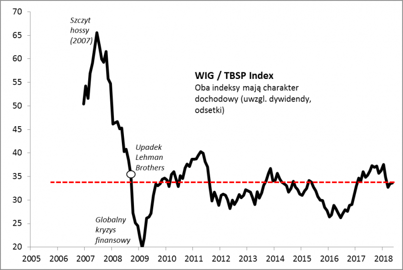 Okazuje się, że również i ten współczynnik jest na poziomach z okresu tuż po upadku Lehman Brothers. Jednocześnie jego wartość jest mniej więcej o połowę (!) niższa niż na szczycie giełdowej hossy w 2007 roku. Owszem, do historycznych dołków jeszcze nie spadł (do nich akurat sporo brakuje), ale ciężko byłoby się upierać przy tezie, że akcje na GPW mają za sobą okres wyjątkowej przewagi nad obligacjami.