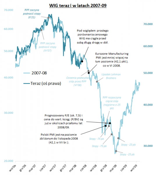 Pamiętajmy też jednak, że nawet tak niskie wyceny nie uchroniły WIG-u przed wykonaniem jeszcze jednego dynamicznego ruchu w ramach ówczesnej bessy, w pierwszych tygodniach 2009 roku. Dotarcie wskaźników wyceny do poziomów zbliżonych do obecnych miało jednak o tyle pozytywne znaczenie w analizowanym historycznych epizodzie, że mimo ostatniej „nogi” rynku niedźwiedzia, potem akcje zaczęły dynamicznie drożeć i szybko odrobiły straty z końcowego etapu bessy. Innymi słowy, obecne wyceny są zachętą do akumulacji walorów, ale nie gwarantują jeszcze natychmiastowego zakończenia trendu spadkowego – to jedna z ważniejszych lekcji z omawianego porównania.