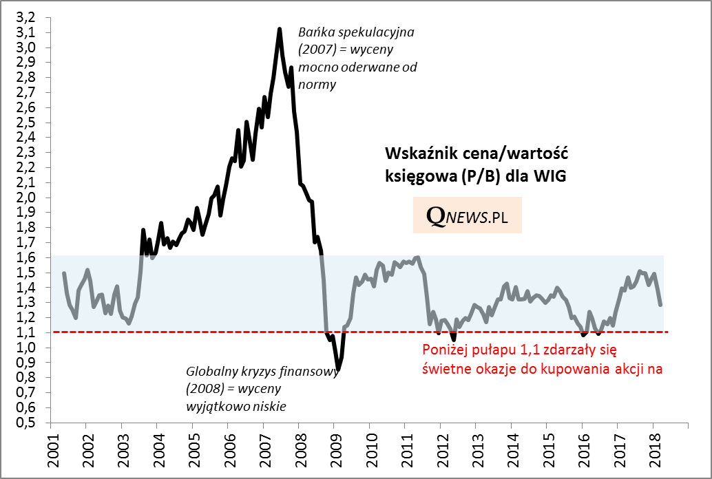 Głębsze były tylko tąpnięcia w latach 2011 i 2015/2016 - oba miały zasięg ok. 27%. Tamta "norma" jak widać nie została jeszcze wykonana, choć trzeba też zwrócić uwagę, że wspomniane dwa ruchy spadkowe sprowadziły wyceny akcji na GPW do okazyjnych poziomów, przy których ... opłacało się kupować. Widać to doskonale na wykresie naszego ulubionego długoterminowego wskaźnika - cena/wartość księgowa.
