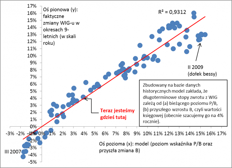 Spadek P/B zgodnie z opisywanym niedawno naszym modelem oznacza, że podnosimy projekcję przyszłych stóp zwrotu do ok. 4% w skali roku w horyzoncie 9-letnim.