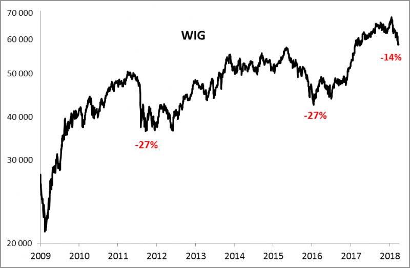 Od miesięcy dużo miejsca poświęcaliśmy czynnikom ryzyka dla rynków akcji. Po drodze ta ostrożność wydawać się mogła nietrafna - jeszcze w styczniu indeksy ochoczo szły w górę - ale w ostatecznym rachunku widać, że została "wynagrodzona" przez wydarzenia rynkowe ostatnich dwóch miesięcy. WIG od szczytu do końca marca spadł o 14% i znalazł się na poziomie najniższym od ... roku. Mamy na GPW do czynienia z jednym z najgłębszych ruchów spadkowych po 2008 roku.