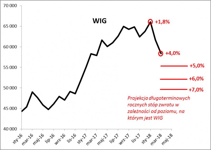 Ewentualny dalszy spadek WIG-u (o ile do niego dojdzie) pociągnąłby za sobą dalsze uatrakcyjnienie długoterminowych perspektyw. Przykładowo gdyby indeks znalazł się w okolicy 55.000 pkt., prognozowana wieloletnia stopa zwrotu urosłaby do +5% w skali roku.