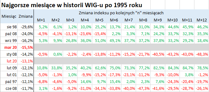 Uwagę zwraca fakt, że zestawienie dla rodzimego rynku wygląda inaczej niż w przypadku Wall Street. Nie tylko jeśli chodzi o pozycje na liście, ale też brak jednoznacznej dominacji "zieleni" w dalszej części tabeli (choć trzeba przyznać, że dominuje ona przynajmniej w ścisłej "czołówce" tabeli, czyli w przypadkach z lat 1998, 1999 i 2008 - w obu po dwunastu miesiącach pojawiają się dwucyfrowe stopy zwrotu).