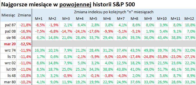 Czy można znaleźć jakiś wspólny mianownik, jeśli chodzi o zmiany S&P 500 po takich fatalnych miesiącach? Uwagę zwraca fakt, że w powyższej tabeli dominuje kolor zielony. Począwszy od dziewiątego miesiąca po fatalnych miesiącach amerykański indeks był na plusie w ośmiu na dziewięć przypadków.
