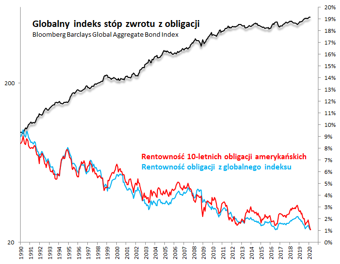 Akcje akcjami, ale warto też zwrócić uwagę na wydarzenia na rynku długu. Rentowność benchmarkowych 10-letnich obligacji skarbowych w USA zeszła do rekordowo niskiego pułapu - w gwałtownym tempie zbliżyła się do niewyobrażalnego niegdyś poziomu 1%. Podobnie wygląda też sytuacja w przypadku globalnego koszyka obligacji.