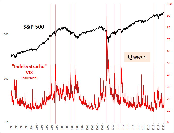 Wskaźnik VIX, popularnie zwany "indeksem strachu" (formalnie pokazuje tzw. implikowaną zmienność wyliczoną z notowań opcji), w trakcie piątkowej sesji zawędrował na chwilę w pobliże pułapu 50 pkt. Nasz przegląd historii pokazuje, że skok tego wskaźnika zalicza się już dzięki temu do dziesięciu największych wyskoków. Co ciekawe w trakcie niemal wszystkich z nich VIX dotarł maksymalnie właśnie w okolicę 50 pkt. Jedynym wyjątkiem od tej reguły był szok po upadku Lehman Brothers (jesień 2008).