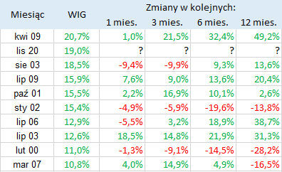 Powyższe zestawienie pokazuje również co działo się po najlepszych miesiącach na GPW. Widać pewną przewagę zieleni w tabeli, aczkolwiek w niektórych przypadkach zdarzały się również scenariusze spadkowe w kolejnych miesiącach.