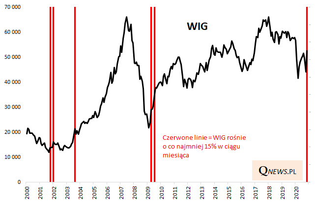 Sytuację rozjaśnić może spojrzenie na wykres. Weźmy pod lupę ścisłą czołówkę, czyli przypadki, w których WIG urósł o co najmniej 15% w jeden miesiąc (co oznacza, że poprzestajemy na pierwszych pięciu przypadkach z powyższej tabeli).