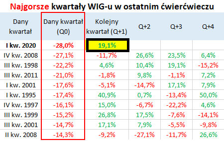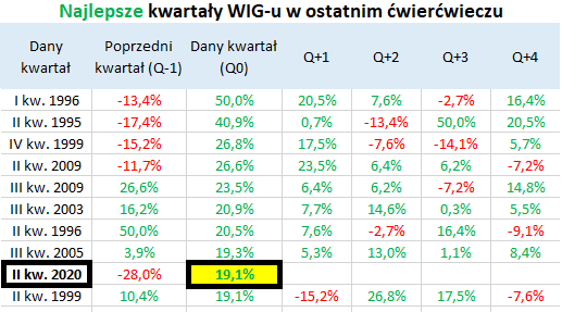 Co ciekawe po tak dobrych wynikach kolejny kwartał (Q+1 w tabeli) przynosił niemal zawsze dalszą zwyżkę WIG-u.