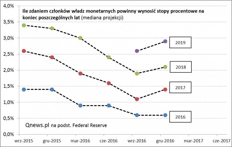 Przez większość roku sygnały na temat pożądanej przyszłej ścieżki podwyżek stóp stawały się coraz bardziej "gołębie". Na grudniowym posiedzeniu to się jednak zmieniło. Członkowie władz monetarnych po raz pierwszy od długiego czasu podnieśli swe oczekiwania odnośnie poziomu stóp w kolejnych latach. Obecnie według tego konsensusu stopy na koniec 2017 r. powinny urosnąć o 0,65 pkt. proc., co oznaczałoby trzy podwyżki w tempie po 0,25 pkt. proc. Czy tak faktycznie będzie? Czas pokaże...