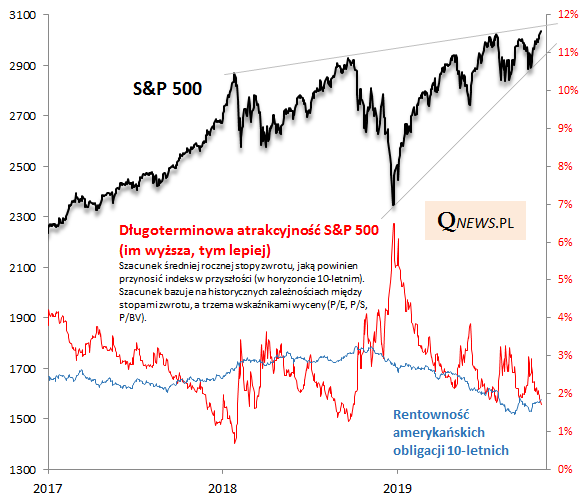Wygląda na to, że po odrobieniu przez S&P 500 ostatnich strat i wzroście wskaźników wyceny długoterminowa atrakcyjność zmalała do relatywnie niskich poziomów. Mniej niż 2% w skali roku - tyle wynosi nasz szacunek średnich rocznych stóp zwrotu na przyszłość (w horyzoncie 10-letnim).