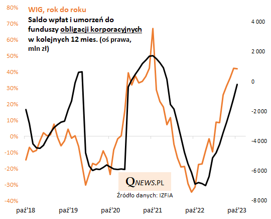 Ciekawostką jest to, że cykl napływów/odpływów do funduszy długu korporacyjnego jest pośrednio związany również z sytuacją na polskim rynku akcji. Nie powinno to dziwić o tyle, że często wyceny i obligacji firm i akcji poruszają się w podobnym kierunku (gdy w ub.r. akcje traciły na wartości, na rynku obligacji rozszerzały się tzw. spready względem papierów skarbowych - w tym roku jest odwrotnie). Poniższy wykres pokazuje, że 12-miesięczne saldo wpłat i umorzeń w segmencie długu korporacyjnego jest skorelowane z 12-miesięczną zmianą WIG-u. To ważna wskazówka na przyszłość.